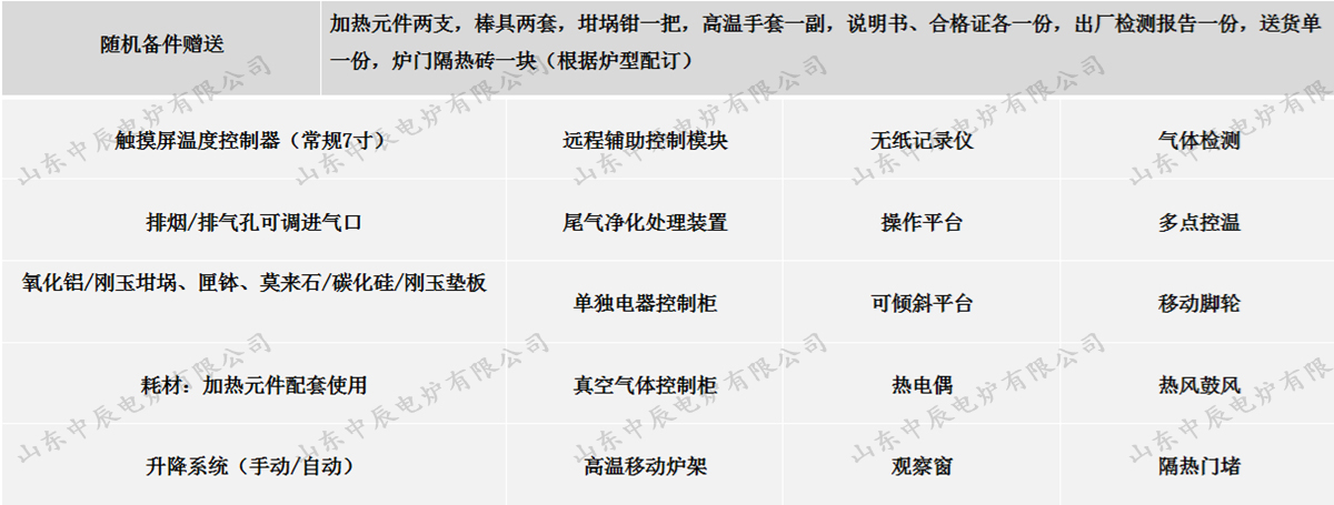 加熱元件兩支,棒具兩套,坩堝鉗一把,高溫手套一副,說明書、合格證各一份,出廠檢測報告一份,送貨單一份,爐門隔熱磚一塊(根據(jù)爐型配訂) |